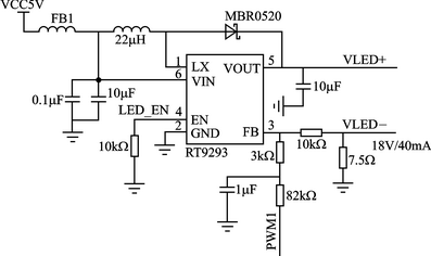 ⑤ 如图7所示,使用RT9293[6]作为背光WLED的驱动芯片,通过RA8875的PWM1来调节反馈引脚(FB)的电压,实现背光亮度调节。另外,RA8875带有一个GPOX引脚,通过访问RA8875的C7h寄存器可修改该引脚的输出电平,在本设计中,将其连至RT9293的使能端(LED_EN),当整个系统准备就绪需打开显示时,再拉高电平使能背光。