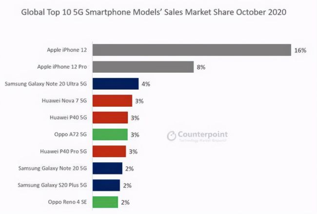 Counterpoint Research发布了10月份全球5G手机的畅销榜单,华为5G手机无缘第一,不过仍具备领先优势