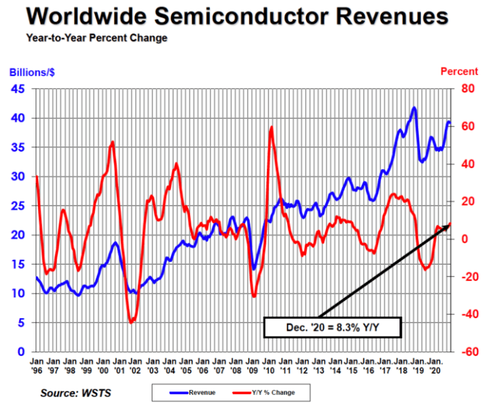 半导体工业协会(SIA)近日宣布,2020年全球半导体工业销售额为4390亿美元,比2019年的4123亿美元增长了6.5%。2020年12月的全球销售额为392亿美元,比2019年12月的总额增长8.3%,比2020年11月的总额减少2.0%。第四季度的销售额为1,175亿美元,比上一季度的总额增长8.3%。2019年第四季度,比2020年第三季度的总和高3.5%。月销售额由世界半导体贸易统计(WSTS)组织汇总 ,代表三个月的移动平均值。SIA收入占美国半导体行业的98%,近三分之二的非美国芯片公司。