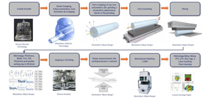 蓝宝石是世界上硬度仅次于金刚石的材料,而且从近紫外到中红外波段均具有很好的透光性,可以作为消费类电子产品的窗口材料。蓝宝石作为LED最主要的衬底材料,占LED芯片衬底市场份额超过95%,其涨价将直接影响LED芯片的价格。其市场需求容易受LED芯片生产领域的MOCVD设备数量、产能利用率等因素的影响。蓝宝石晶片制造流程: