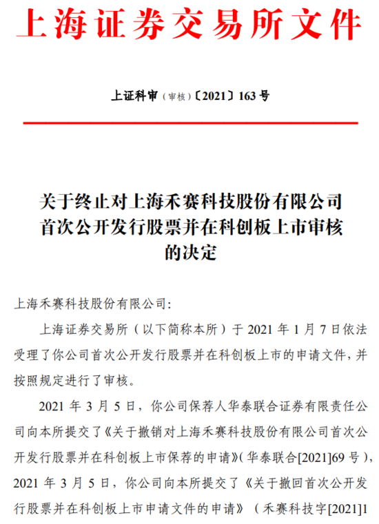 2021年3月5日,禾赛科技保荐人华泰联合证券有限责任公司向上交所提交了《关于撤销对上海禾赛科技股份有限公司首次公开发行股票并在科创板上市保荐的申请》(华泰联合[2021]69 号),2021年3月5日,禾赛科技向上交所提交了《关于撤回首次公开发行股票并在科创板上市申请文件的申请》(禾赛科技字[2021]1 2 号),申请撤回申请文件。根据《上海证券交易所科创板股票发行上市审核规则》第六十七条的有关规定,上交所决定终止对你禾赛科技首次公开发行股票并在科创板上市的审核。