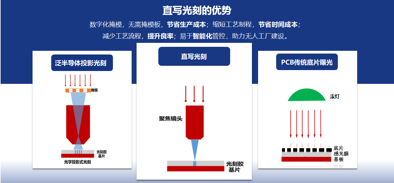 从掩膜光刻技术和直写光刻技术在泛半导体领域不同细分市场的应用情况对比来看,掩膜光刻技术主要用于高精度IC前端制造;直写光刻主要为高精度IC前端制造提供高精度的掩模板,以及少量多品种的IC制造。业内人士指出,直写光刻技术无需掩模板,在缩短制程、自动涨缩、多层对位、少量多品种生产、曲面曝光以及一片一码的智能工厂建设方面有着明显的优势。