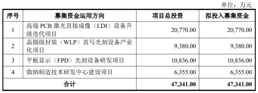 为进一步开拓新的应用场景,芯碁微装本次募集资金在扣除发行相关费用后拟用于高端PCB激光直接成像(LDI)设备升级迭代项目、晶圆级封装(WLP)直写光刻设备产业化项目、平板显示(FPD)光刻设备研发项目和微纳制造技术研发中心建设项目。