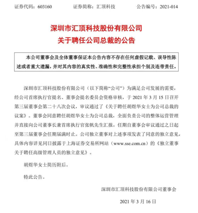 深圳市汇顶科技股份有限公司(以下简称“公司")为满足公司发展的需要,经公司首席执行官提名、董事会提名委员会资格审核,于2021年3月15日召开第三届董事会第二十八次会议,审议通过了《关于聘任胡煜华女士为公司总裁的议案》。董事会同意聘任胡堤华女士为公司总裁,全面负责公司的整体雇营管理并直接向公司董事长兼首席执行官张帆先生汇报,任期自董事会审议通过之日起至第三届董事会任期届满时止。公司独立董事对上述事项发表了同意的独立意见,具体内容详见同日披露于上海证券交易所网站(www.sse.com.en)的《独立董事关于聘任高级管理人员的独立意见》 .目前汇顶科技有7个副总裁,分别是侯学理、傅必胜、柳玉平、周波、叶金春、王丽副总和张利刚。董事长张帆兼任总经理,CEO。未来张帆担任董事长兼CEO。