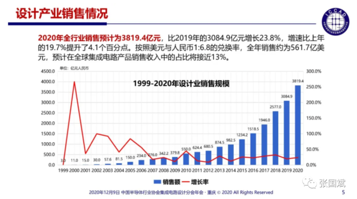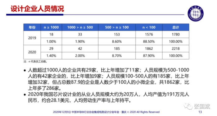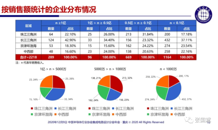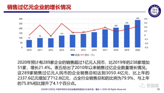 不过在ICCAD2020上,中国半导体行业协会集成电路设计分会理事长魏少军教授指出,中国半导体行业协会年度统计的企业是2218家,其中,有289家企业的销售超过1亿元人民币,比2019年的238家增加51家,增长21.4%,这289家销售过亿元人民币的企业销售总和达到3050.4亿元,占全行业销售总和的比例为79.9%。
