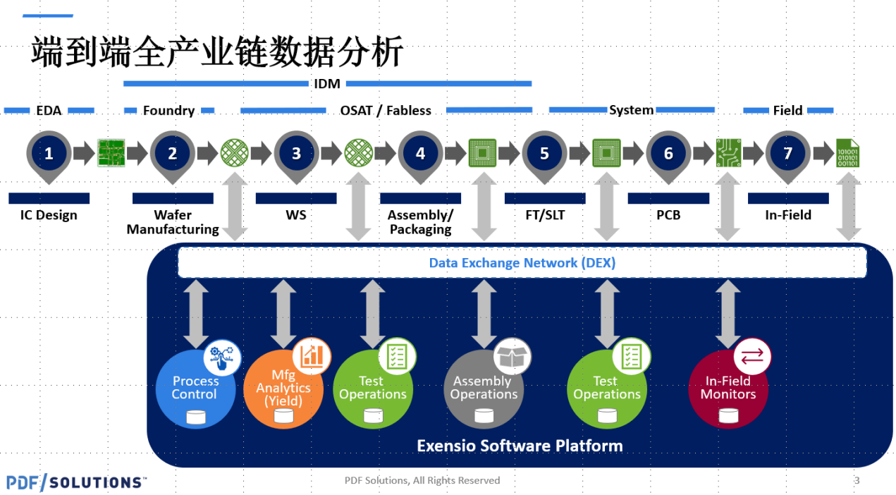 据了解,普迪飞的端到端分析平台Exensio平台,具备了大数据整合,清洗与分析功能,可以为整个产业链上的各种公司提供服务。如果将整个产业链以设计、晶圆制造和封装测试三大环节来划分,针对每一环节的特性,普迪飞均有对应的产品模块。