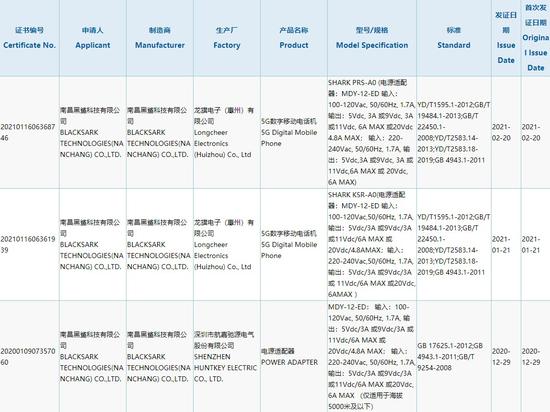3C 认证显示,这款 5G 手机申请人、制造商为南昌黑鲨科技有限公司,生产厂为龙旗电子(惠州)有限公司,首次发证日期为 2 月 20 日。