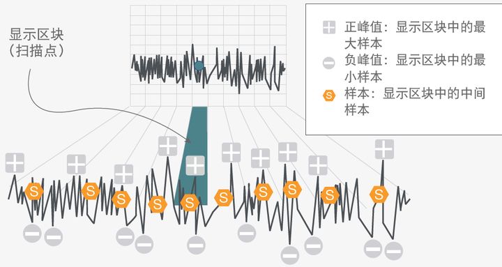 ADC 能够采集并输出大量数据。实际上,您在 ADC 中获得的数据点通常比需要显示的数据点多。在保持信号准确性的前提下,您可以将数据分成多个区块,然后从每个区块中选择一个数据点,在屏幕上重构信号。这就是数字检波器所做的工作。