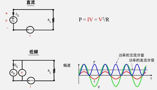 对于低频信号来说,电压和电流都会随时间发生变化。能量传递速率(瞬时功率)也会随时间发生变化。在图1中,瞬时功率(P)围绕周期(蓝色曲线)发生改变。通过对P曲线以下的面积进行积分运算,可以求取平均值。