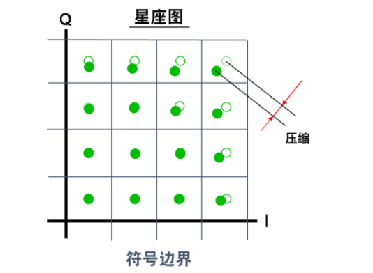 在理想情况下,放大器拥有恒定增益,因此,Pout与Pin呈线性关系。在高输入电平时,开始进入饱和或压缩(也称为AM到AM)区域。它将对基带IQ星座图造成压缩。