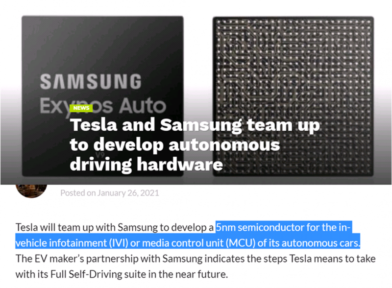国内关于特斯拉与三星的报道似乎有误:“为其自动驾驶汽车的车载信息娱乐(IVI)或媒体控制单元(MCU)开发一种5nm半导体。”