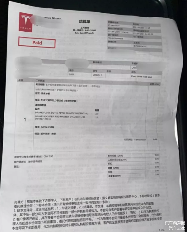 根据此前新浪微博网友@特斯拉维权车主-韩潮所公开的资料来看,特斯拉确实有案例是因为客户反映刹车异常,经过检修诊断为iBooster问题,最终以更换刹车助力器总成的方式消除过故障。