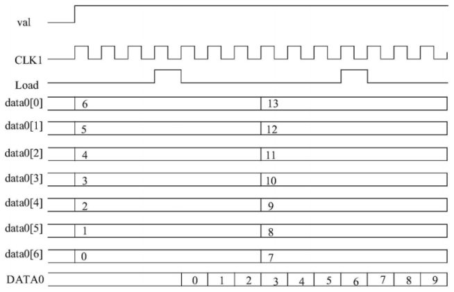 在有效输出信号val为高电平,且一个像素时钟内数据已稳定了3个采样时钟周期,加载信号Load被拉高并持续一个采样时钟周期,这样以后每一个像素时钟周期内都会有一个加载信号Load的下降沿,可用于锁存并行数据。