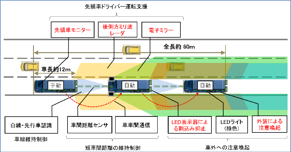 试验车辆俯视图(红字为2019年新增部分)从图中可见,最前方车辆为手动驾驶,后方跟随的2辆车为自动驾驶,单车长12m、队列全长约60m,增加了LED插队警示装置、车外警示,最前方车辆驾驶员辅助系统包括后车监测、后侧方毫米波雷达、电子后视镜,后车具备车道保持功能,通过车间距传感器和车车间通讯来维持短车间距。