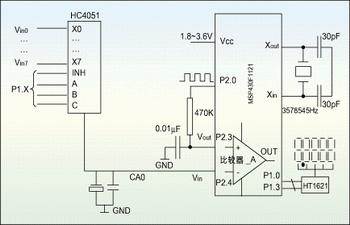 该芯片具有一个内置模拟电压比较器,只须外接一只电阻和电容即可构成一个类似于Σ-Δ技术的高精度单斜率A/D。一般而言,比较器在使用过程中会受到两种因素的影响,一种是比较器输入端的偏置电压的积累;另一种是两个输入端电压接近到一程度时,输出端会产生振荡。