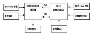 微控器原理如图4所示。本系统处理器使用STM2F103C8,时钟由CPLD分频供给CPU,通过SPI方式将数据和命令传送给CPLD,而后用串口RS232发送到上位机显示