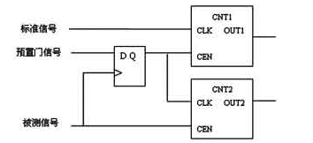 图2为等精度测频逻辑框图,CNT1和CNT2是两个可控计数器,标准频率信号fs信号从CNT1的时钟输入端CLK输入,经整形后的被测信号fx从CNT2的时钟输入端CLK输入。每个计数器中的CEN输入端为时钟使能端,控制时钟输入。当预置门信号为高电平(预置时间开始)时,被测信号的上升沿通过D触发器的输出端,同时启动两个计数器计数;同样,当预置门信号为低电平(预置时间结束)时,被测信号的上升沿通过D触发器的输出端,同时关闭计数器的计数。