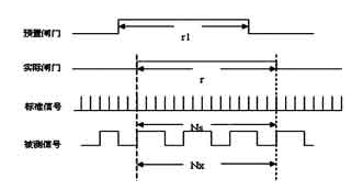 在测量过程中,有两个计数器分别对标准信号和被测信号同时计数。首先给出闸门开启信号(预置闸门上升沿),此时计数器并不开始计数,而是等到被测信号的上升沿到来时,计数器才真正开始计数。然后,预置闸门关闭信号(下降沿)到来时,计数器并不立即停止计数,而是等到被测号的上升沿到来时才结束计数,完成一次测量过程。可以看出,实际闸门时间r与预置闸门时间r1并不严格相等,但差值不超过被测信号的一个周期。设在一次实际闸门时间r中,计数器对被测信号的计数值为Nx,对标准信号的计数值为Ns,标准信号的频率为fs,则被测信号的频率如式(1)所示。