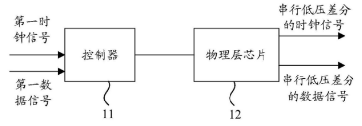 如上图,为该专利中发明的低压差分信号发送器的结构示意图,该发送器主要包括控制器11和物理层芯片12,控制器用于接收第一时钟信号,并对第一时钟信号进行处理以得到第二时钟信号,在第二时钟信号的驱动下读取第一数据信号,并输出第三时钟信号和第二时钟信号。