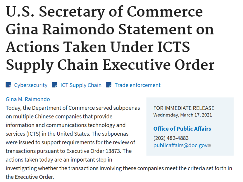 2021年03月18日 | 美国商务部向多家中国通讯公司发传票 调查国安风险