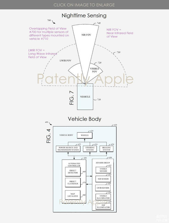 苹果公司表示,夜间或弱光环境对自动车辆控制系统非常具有挑战性。例如,车辆大灯在夜间发出的光照强度可能会受限于法律或法规,而法律或法规又可能会限制用于检测车辆路径内或附近的可见光传感器(如摄像头)的有效监测范围。
