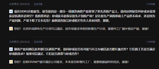 对此,北京君正在投资者互动平台表示,北京矽成原有生产计划可以满足,因市场需求导致的新增生产计划,需要向工厂额外预定产能。