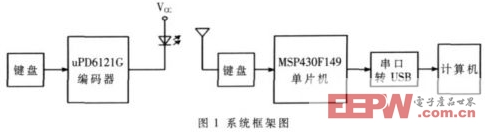整个系统由发射电路、接收电路和计算机软件三部分组成。发射部分, 即手持教鞭部分, 以日本NEC 的uPD6121G 为控制核心。首先, 当按下按键后, 扫描键盘得到遥控码, 不同的键值对应不同的编码信息, 此键值信息代表着向计算机中演示的软件PowerPoint 发送的控制命令, 然后将此编码信息经调制后由红外发光管向外发射。接收部分的控制核心为TI 公司推出的低功耗MSP430 单片机, 主要完成发射端传送来的红外调制信息的接收和解码操作, 将解析出的控制命令信息经串口转USB 接口传送至计算机, 此硬件模块可直接插在计算机的USB 接口中, 直接由USB 接口供电; 计算机中的上位机软件采用C# 编写, 使用Microsoft Studio 2005 自带的SerialPort 组件。SerialPort 对象接收到数据时, 将在辅助线程上引发DataReceived 事件。处理此事件, 得到从串口发送来的控制命令数据信息, 实现控制多媒体演示软件PowerPoint 的目的。系统框架如图1 所示。