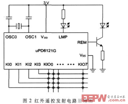 通用红外遥控发射电路由编/解码专用集成电路芯片uPD6121G 进行控制操作,发射部分包括键盘矩阵、编码调制、LED 红外发送器等部分。电路原理图如图2 所示。