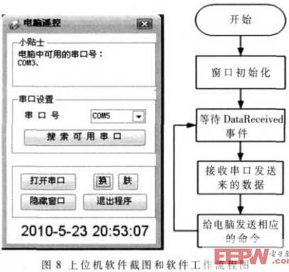 本软件界面人性化, 用户在设置过程中有简单的操作提示, 使得人机对话更为简单, 当设置完成后可以让程序隐藏到后台运行。小软件还有漂亮的皮肤界面, 上位机软件截图和软件的工作流程如图8 所示。