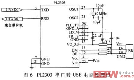 由于RS232 标准串行接口已逐渐在电脑主板中淘汰, 为了充分利用USB 接口即插即用的特点, 本设计采用了PL2303 芯片实现了RS232 与USB 接口的转换, 省去了RS232 电平以TTL 电平的装换。用PL2303 实现的USB 转串口的电路如图6 所示。