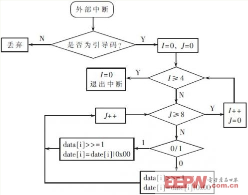 单片机采用TI 的低功耗MSP430F149 为控制核心,其主要功能是解码红外遥控器发送来的信号和驱动液晶显示。其中解码红外遥控信号是实现本设计的关键,红外接收电路的信号输出接到单片机的外部中断0 上,当单片机接收到信号后进入中断函数, 首先判断是否为引导码, 如果是则进入解码程序, 否则丢弃。解码程序通过精确的延时函数, 判断每个发送过来的每一位为0 还是1, 并把数据保存到date 数组中, 其中date [0] 保存地址码,date [1] 中保存地址反码,date [2] 中保存数据码,date[3] 保存数据反码。解码的流程图如图7 所示。