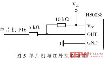 接收电路使用一体化红外接收头HS0038 , 接收红外信号频率为38 kHz , 接收距离可达35 m。它能将遥控信号的接收、放大、检波、整形集于一身, 并且输出可以让单片机识别的TTL 信号, 这样大大简化了接收电路的复杂程度和电路的设计工作, 方便使用。其与单片机连接原理图如图5 所示, 由单片机采集红外遥控命令并在内部完成解码工作