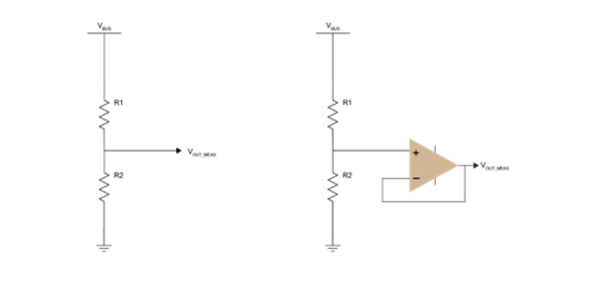 如前文所述,电功率是电压与电流的乘积。要精确测量功率,需要对电压和电流进行精准测量。在一定时段内测量功率并将结果累加,即得到能量。功耗在大多数情况下都不是恒定值,因此,必须使用一个选定测量带宽,在此范围内对电压和电流进行测量。直流电压测量电路的一个典型示例是图1左侧所示的简单分压器和右侧图1所示的缓冲分压器。这两个电路都可以通过适当的校准提供高精度测量结果,尽管带缓冲的分压器比不带缓冲的分压器价格昂贵,但前者通常功耗更低,尤其适合测量极低的直流信号。