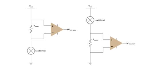 由于分流电阻与电路的其余部分串联,因此可以连接在任意一侧:上桥臂(分流电阻的一个端子直接连接总线电压),或者下桥臂(分流电阻的一个端子接地),如图2所示。在这两种情况下,分流电阻都会出现一个小的压差,电路的总电压会降低。但是,分流电阻的连接位置会有一些影响: