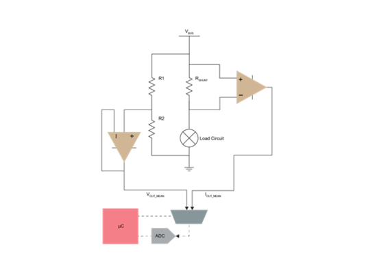 虽然借助霍尔效应也可以测量电流(包括直流电流),但本文侧重于使用分流电阻测量直流电流,因为后者更常用而且费用更低。分流电阻是一个低阻值电阻,与电路串联。电流流经分流电阻时,分流电阻两端会产生一个小的压差。该压差与电流成正比,如公式2所示,并且通常使用运算放大器进行放大。
