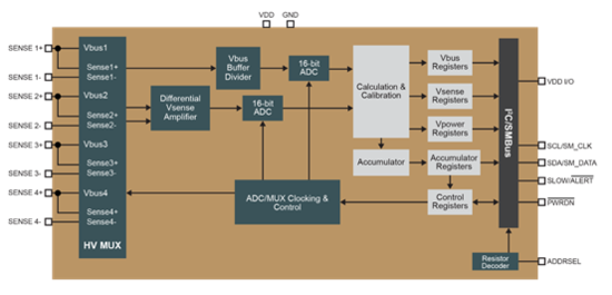 图4-MicrochipPAC1934框图(可同时测量4个通道)