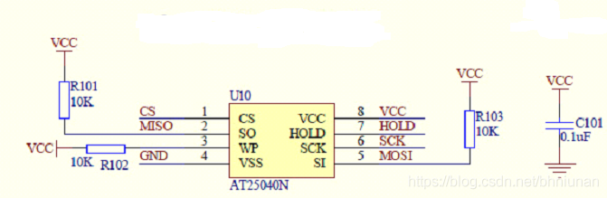 AT25040N为存储容量为4K的EEPROM存储器,在这个实验中使用SPI接口进行数据的读和写。硬件电路的原理图如下图所示。