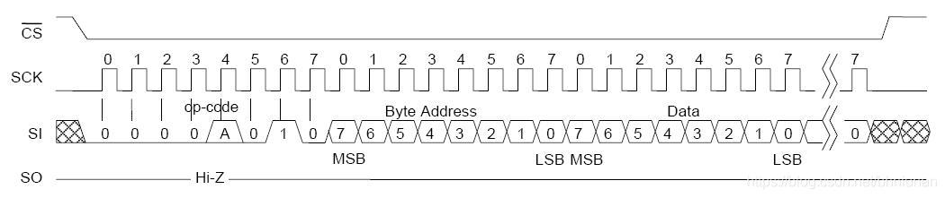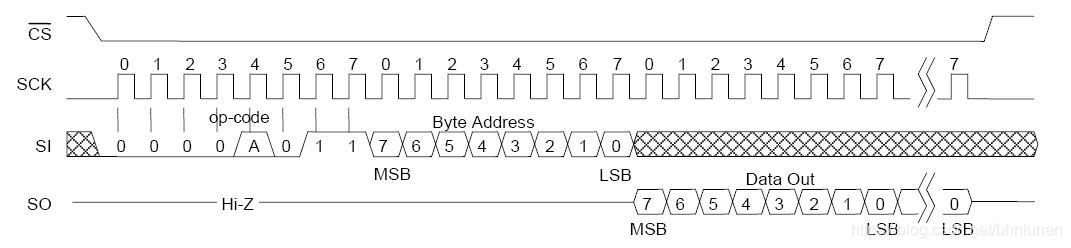 单片机由AT25040N读取数据的格式如下。首先是“op-code”命令,之后是读取数据地址的低8位,之后是要读取的数据。