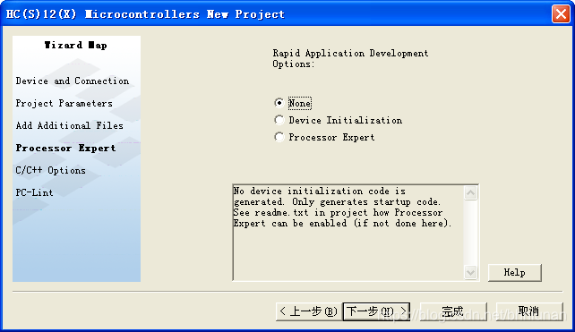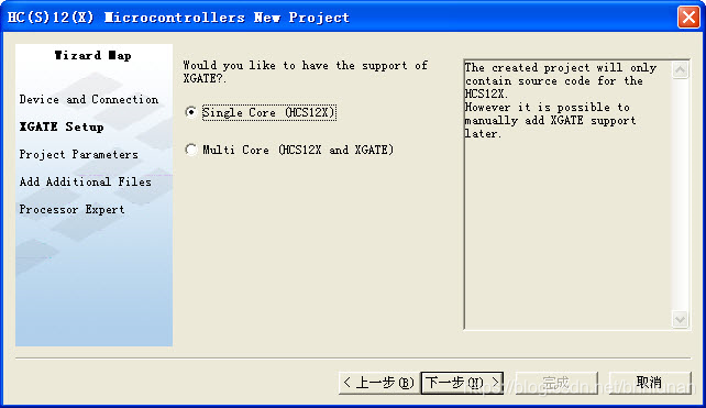4)在图3.4窗口中选择“Single Core (HCS12X)”,此项设置为设置单片机的工作模式的,选择为单核模式,点击“下一步”,出现如下图所示的窗口。