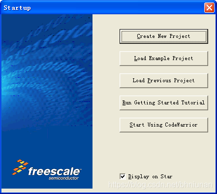 1) 点击电脑左下角的开始菜单,开始>所有程序>Freescale CodeWarrior> CodeWarrior development studio for S12(X) V5.1> CodeWarriorIDE。IDE开始运行,出现下图所示的窗口。