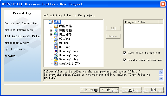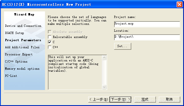 5)在图3.5窗口左侧的复选框中选择“C”,确定编程语言,在此窗口的右侧设定工程名和工程的保存位置,这两项是使用者可以随意修改的,但不要改变工程的扩展名。设置好之后点击“下一步”,出现如下图所示的窗口。