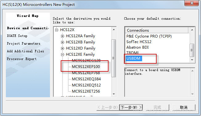 3)在左边的框中点开HCS12X,再点开其中的HCS12XE Family,选中其中的MC9S12XEP100。在右边的框中选中USBDM,如下图所示。