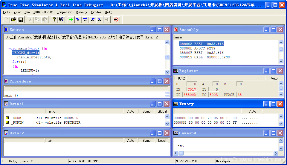 #include #include "derivative.h" #define LEDCPU PORTK_PK4 #define LEDCPU_dir DDRK_DDRK4 void delay(void) { unsigned int i; for(i=0;i<50000;i++); } void main(void) { LEDCPU_dir=1; EnableInterrupts; for(;;) { LEDCPU=1; delay(); LEDCPU=0; delay(); } } 这是一个闪灯的代码,发光二极管采用单片机PK4口进行控制。 用USBDM调试器将单片机的电路板与电脑连接起来,并给电路板供电。点击开发环境的Project-->Debug菜单。可以下载程序,会出现如下窗口。 点击窗口中的“Open BDM”,如果当前单片机中有程序在执行,则会跳出另外一个窗口,如下图所示。 直接点击“确定”,开始下载程序,直到程序下载完成,出现如下图所示的调试窗口。 点击Run-->Start/Continue菜单,程序开始运行,则可以看到LED灯在闪。