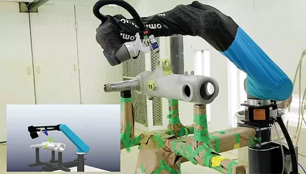 机器人在航空航天零件上进行粉末喷涂,并在其旁边显示了对同一过程的仿真-所有这些过程都是实时自动编程的。照片由Omnirobotic提供