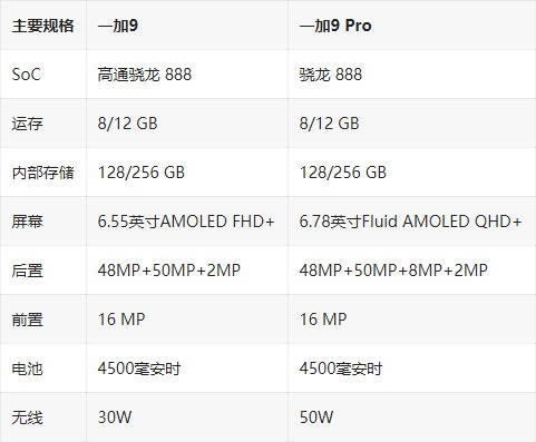 一加 9 和一加 9 Pro 具有几乎完全相同的规格,主要在于屏幕和镜头设计有所区别(一加 9 是直屏,9 Pro是曲面屏),下面简单列举一些大家比较关心的参数。