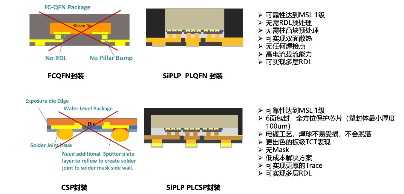 吴建忠介绍,矽磐的PLP技术(SiPLP)来自于新加坡PEP的技术授权和合作开发,目前有CSP/BGA、LGA、QFN/DFN三种封装形式,优势在于小尺寸、大功率、高频率和高可靠性等方面。具体来看,不需要Bumping/Copper Pillar中道工序,可以应付更大电流,可以做到6个面有保护,可靠性达MSL1,特别适合汽车电子。因为无基板或框架,尺寸上比FC更薄;没有Bumping,无需Reflow,无缝连接,产品性能更好,可靠性更高;也可以做Copper Clip PQFN,并且可以实现Double Cooling双面散热,特别适合功率封装,多芯片封装和嵌入无源器件的模块封装等等。根据不同封装形式,适用于笔记本电脑、可穿戴设备电源管理、快充、无线充电等消费电子,服务器、PC板卡、图形卡等工控设备,以及存储、网络系统、通讯基站、高端电视等等。