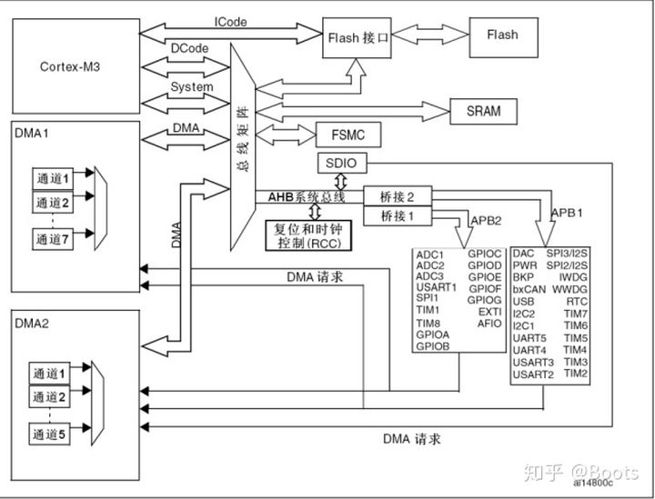 ST公司提供的总线矩阵,DMA控制器,AHB总线,APB总线,以及各个外设控制器