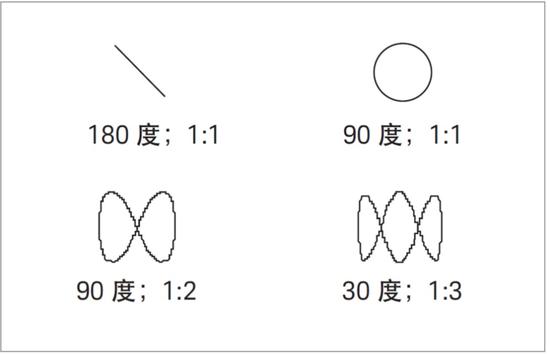 根据 Lissajous 图的形状可以得知两个信号之间的相位差与频率比。图 11 显示了 Lissajous 图及其代表的相位差/频率比。