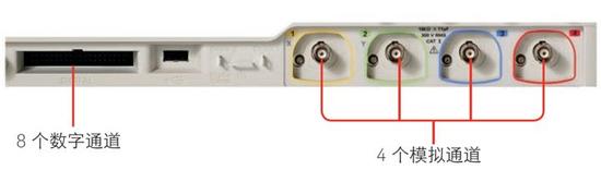 图 13. 混合信号示波器的前面板输入提供了 4 个模拟通道和 8 个数字通道