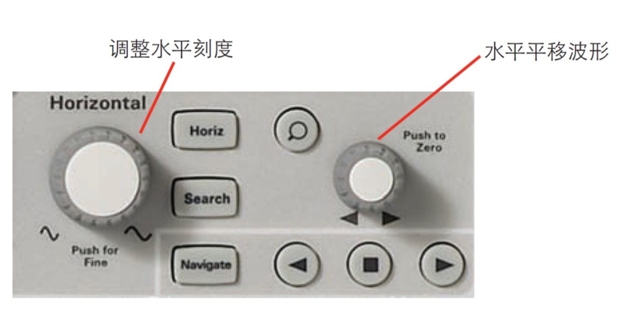 示波器的水平控制机构通常集中在前面板上标示为 Horizontal 的区域。这些控制机构可以让您调整显示屏的水平刻度。其中有一个控制机构可以指定 x 轴的每格时间。同样,只要减少每格时间,您就可以放大显示较窄时间范围内的波形。另外还有一个控制机构可调整水平延迟(偏置),它可以让您扫描一个时间范围。图 17 是Keysight InfiniiVision 2000 X 系列示波器的水平控制区域。